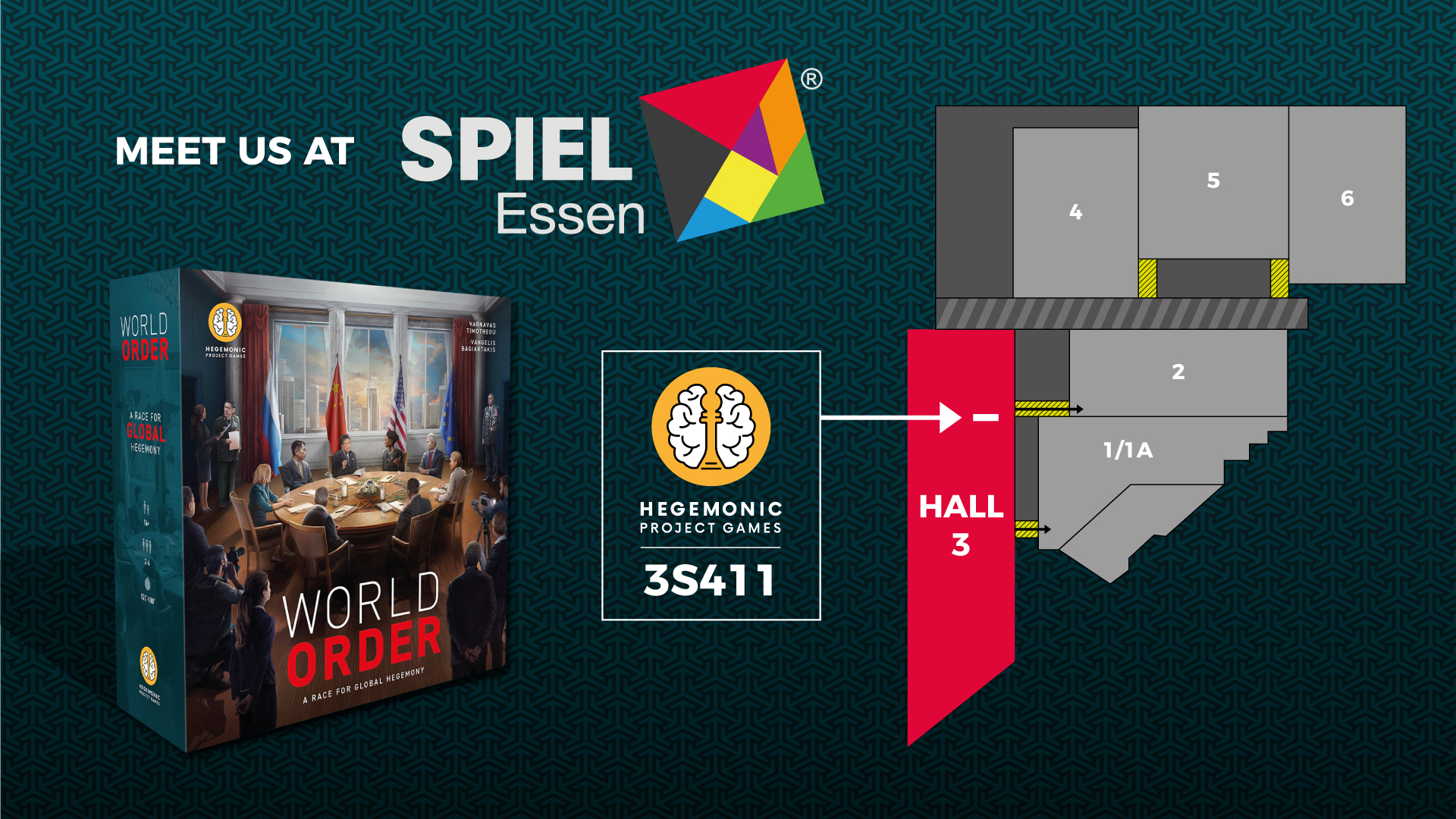 Wir laden dich ein, uns am Stand 3S-411 während der SPIEL Essen 2024 zu besuchen und World Order hautnah zu erleben. Erlebe, wie es ist, sich in der komplexen Welt internationaler Beziehungen zu bewegen und um globale Dominanz zu kämpfen. Verpasse außerdem nicht die Gelegenheit, Hegemony zu spielen, unser preisgekröntes Spiel, welches die Brettspielwelt im Sturm erobert hat.